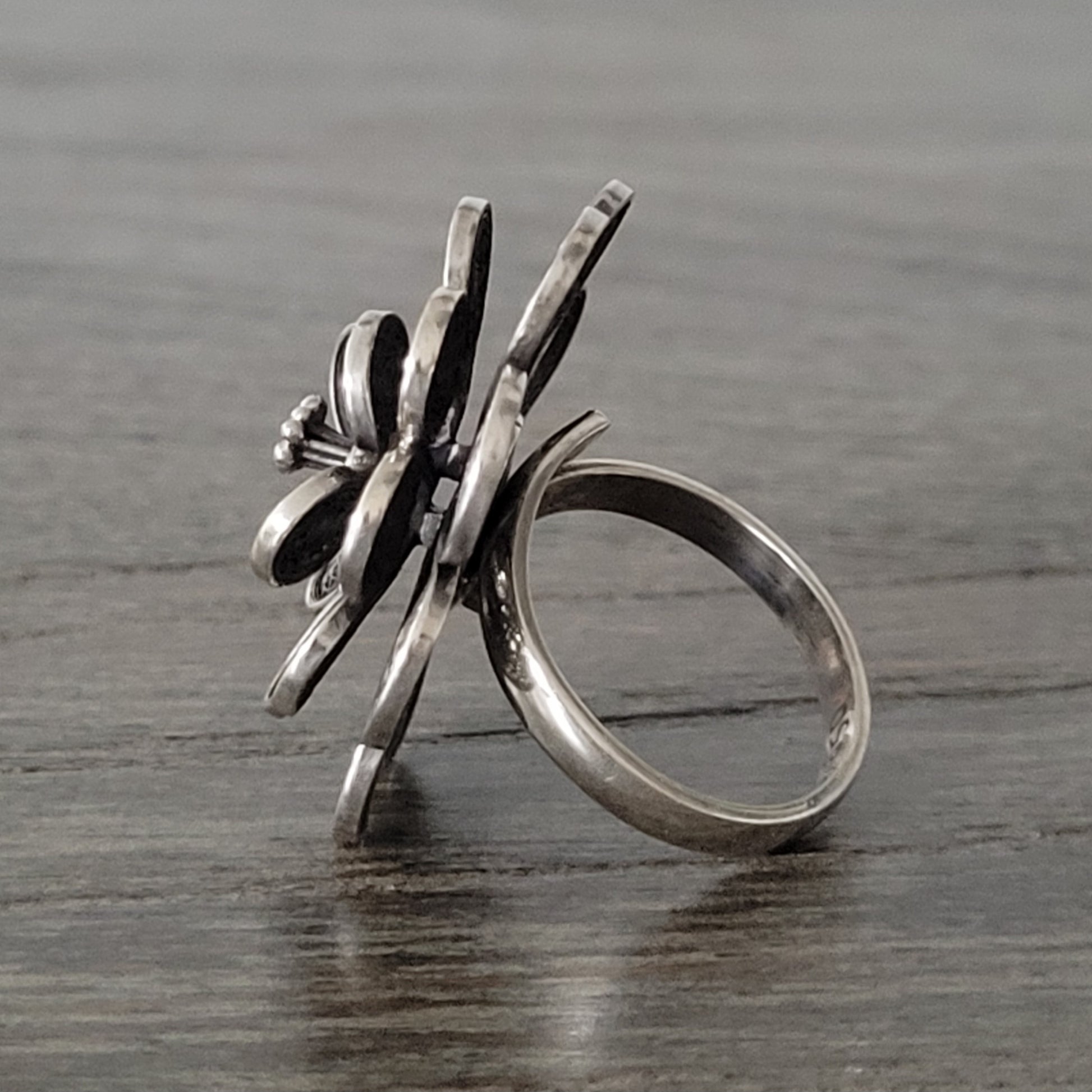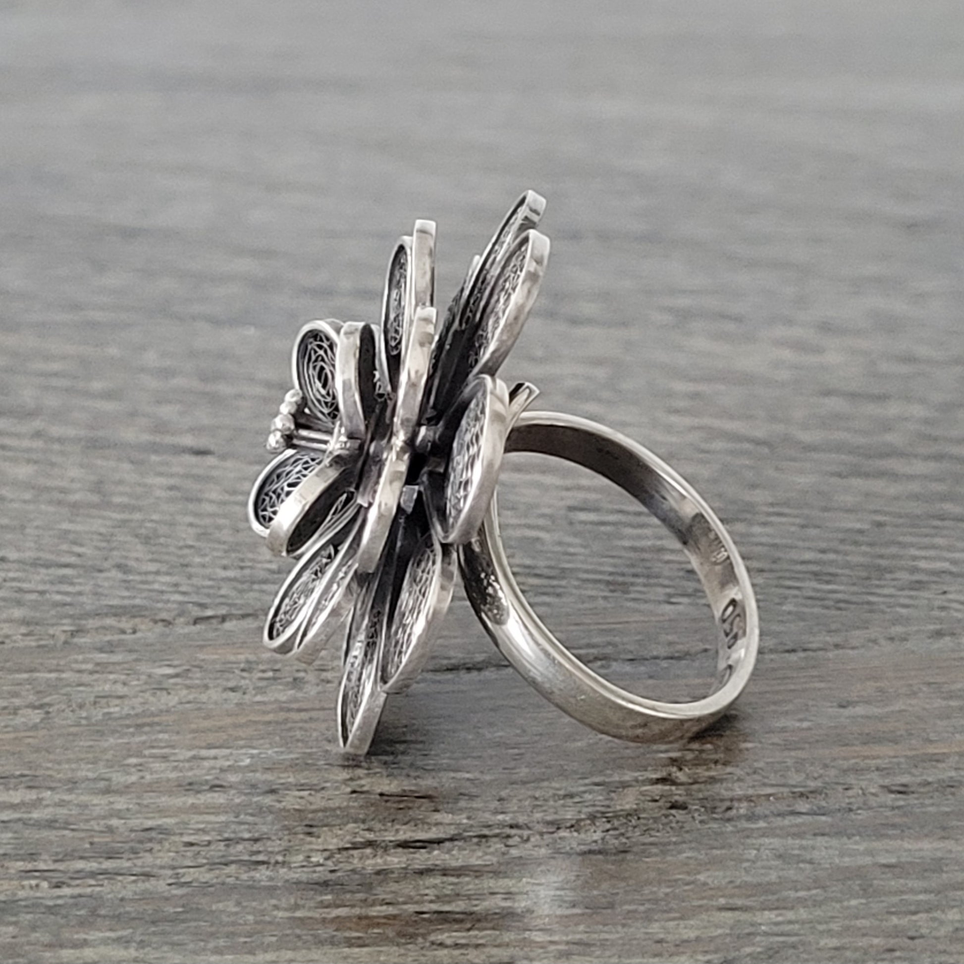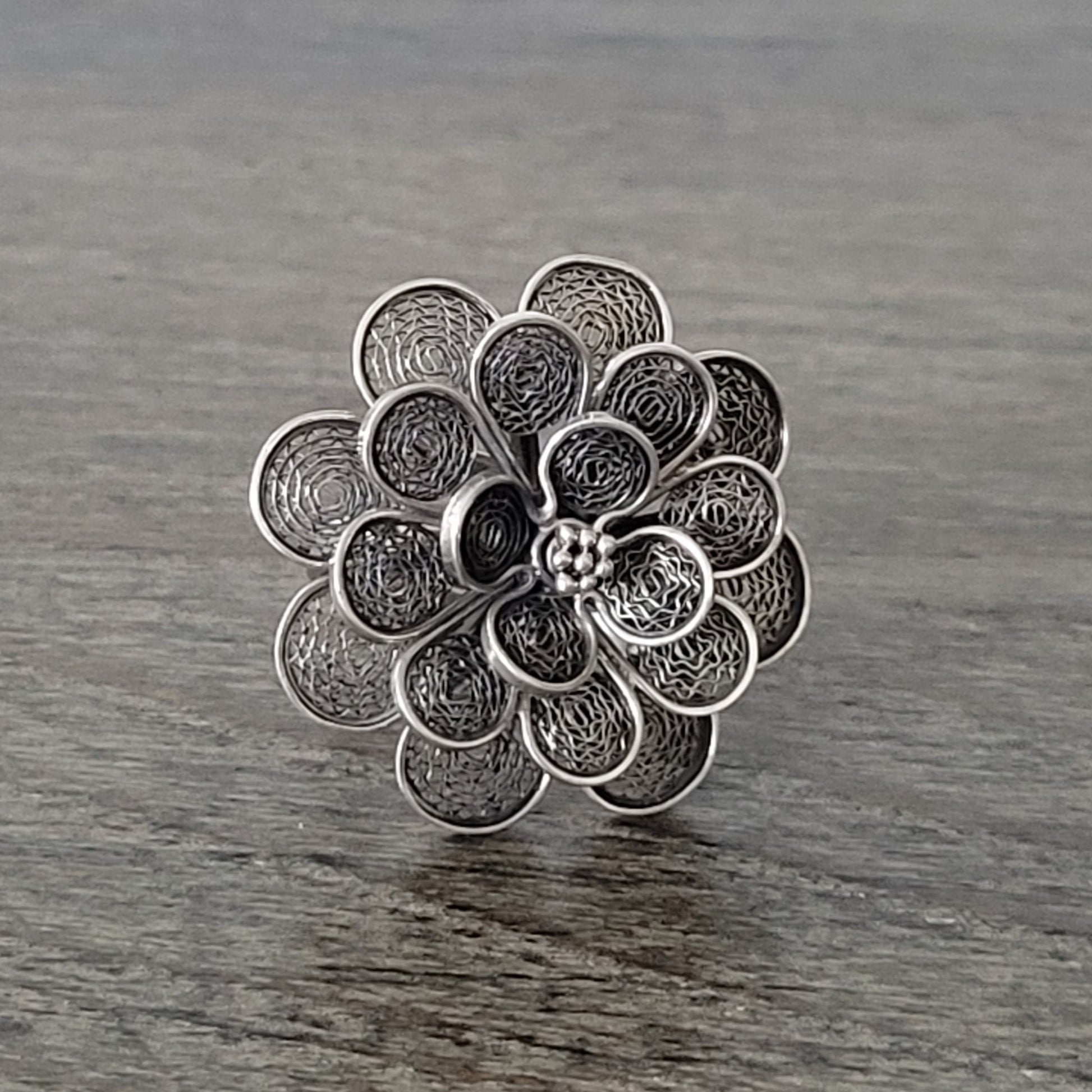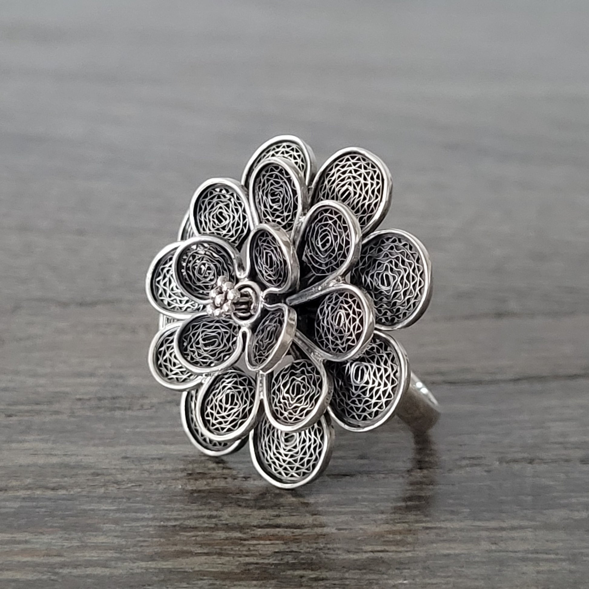 Elevate your jewelry collection with this stunning adjustable ring, meticulously crafted from premium peruvian 950 silver, renowned for its exceptional purity and brilliant luster. The intricate, floral-inspired design features delicately woven petals adorned with exquisite filigree work, showcasing exquisite craftsmanship that adds a touch of sophistication to any ensemble.