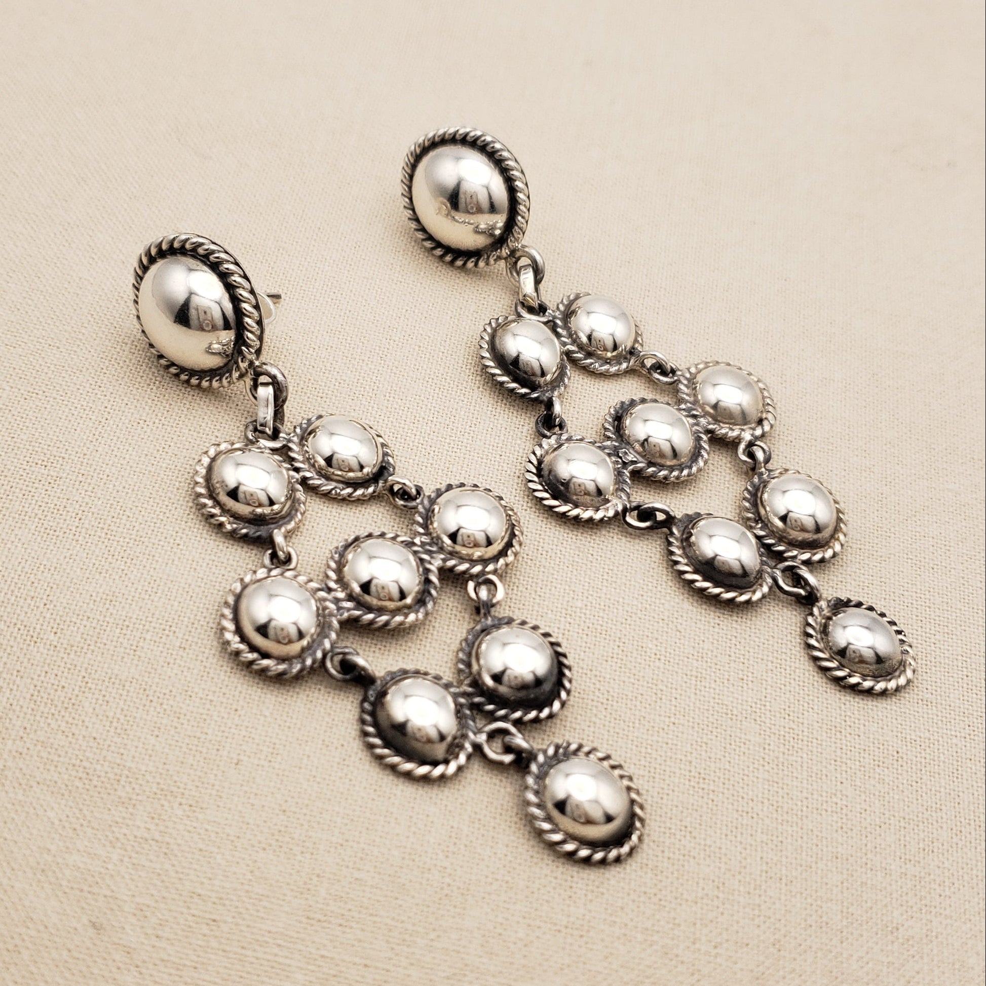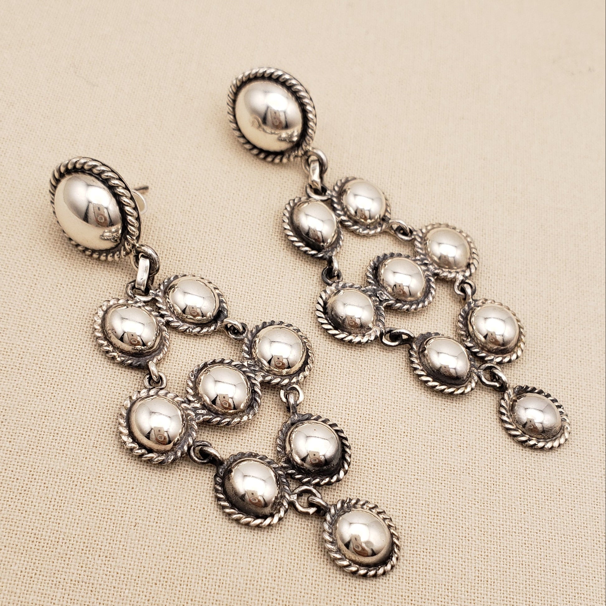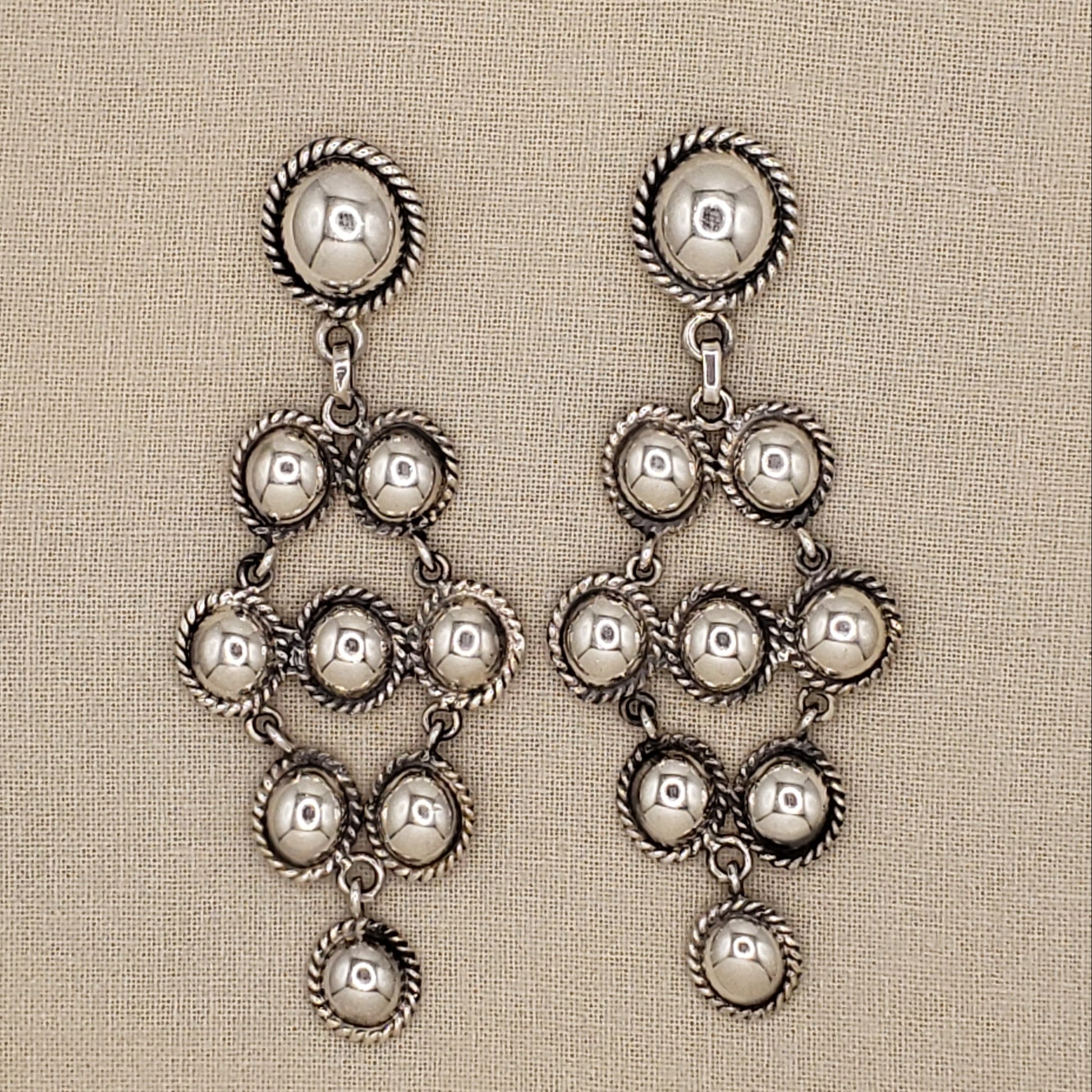 Experience the elegance of Peruvian silver with these cascading long earrings. Featuring polished spheres and twisted borders, in a symmetrical cascading design inspired by Andean heritage. Perfect for a boho-chic look. Handmade in Peru.
