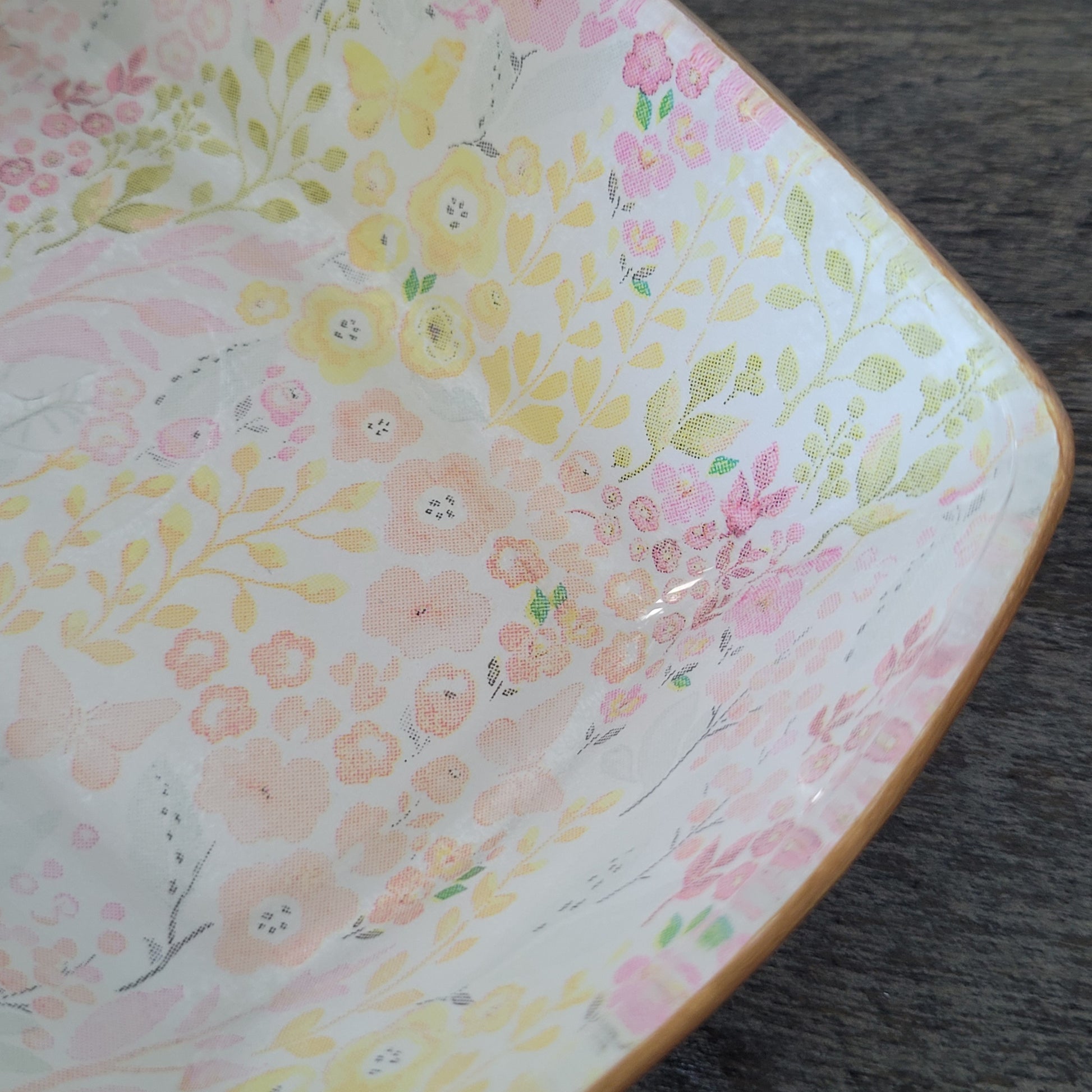Bring a whisper of springtime romance to your space with this exclusive Enchanted Garden glass tray, meticulously handcrafted and painted by Amelia Fine Crafts, using the timeless decoupage technique. Featuring a soft pale base alive with watercolor-inspired wildflowers in delicate blush pinks, sunny yellows, and fresh greens, this piece captures the gentle charm of a blooming meadow in soft morning light. Each layer of tissue-thin paper is artfully layered and sealed for a glossy, durable finish, ensuring every petal edge and leafy vine pops with hand-painted precision.