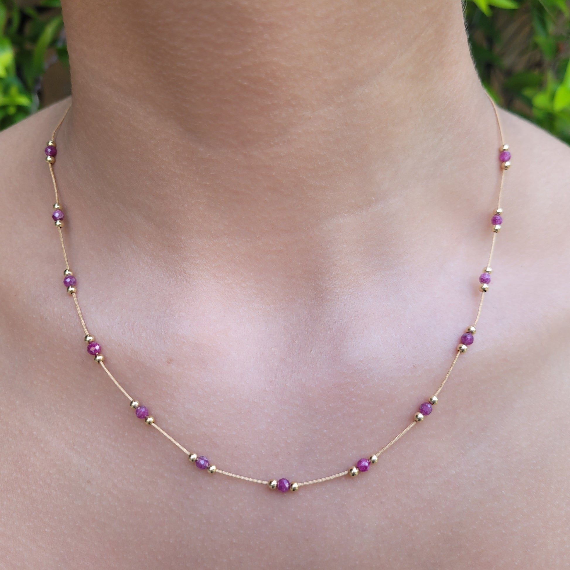 Elevate your everyday style with our exquisite Pink Sapphire Necklace – a delicate masterpiece that blends timeless sophistication with a pop of vibrant color. Crafted from fine jewelry thread and 14k gold-filled beads, this choker-style piece features hand-strung, faceted pink sapphires that sparkle with rosy hues, perfectly spaced for subtle allure. Each gem catches the light, adding a whisper of luxury to your look without overwhelming it.