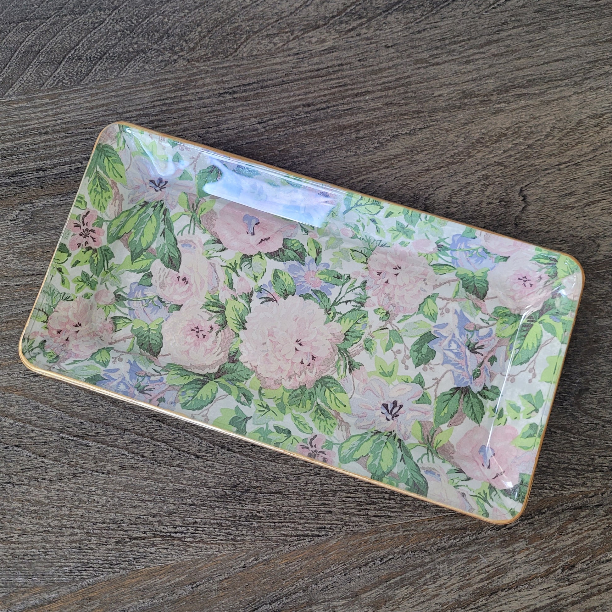 Bring a bloom of romantic elegance to your space with this exclusive glass tray, meticulously handcrafted and painted by Amelia Fine Crafts, using the timeless decoupage technique. Featuring a soft pale base alive with watercolor-inspired florals in delicate blush pinks, lush greens, and whispers of blue, this piece captures the timeless charm of an English cottage garden in full spring flourish. Each layer of tissue-thin paper is artfully layered and sealed for a glossy, durable finish, ensuring every petal curl and leafy tendril pops with hand-painted precision.